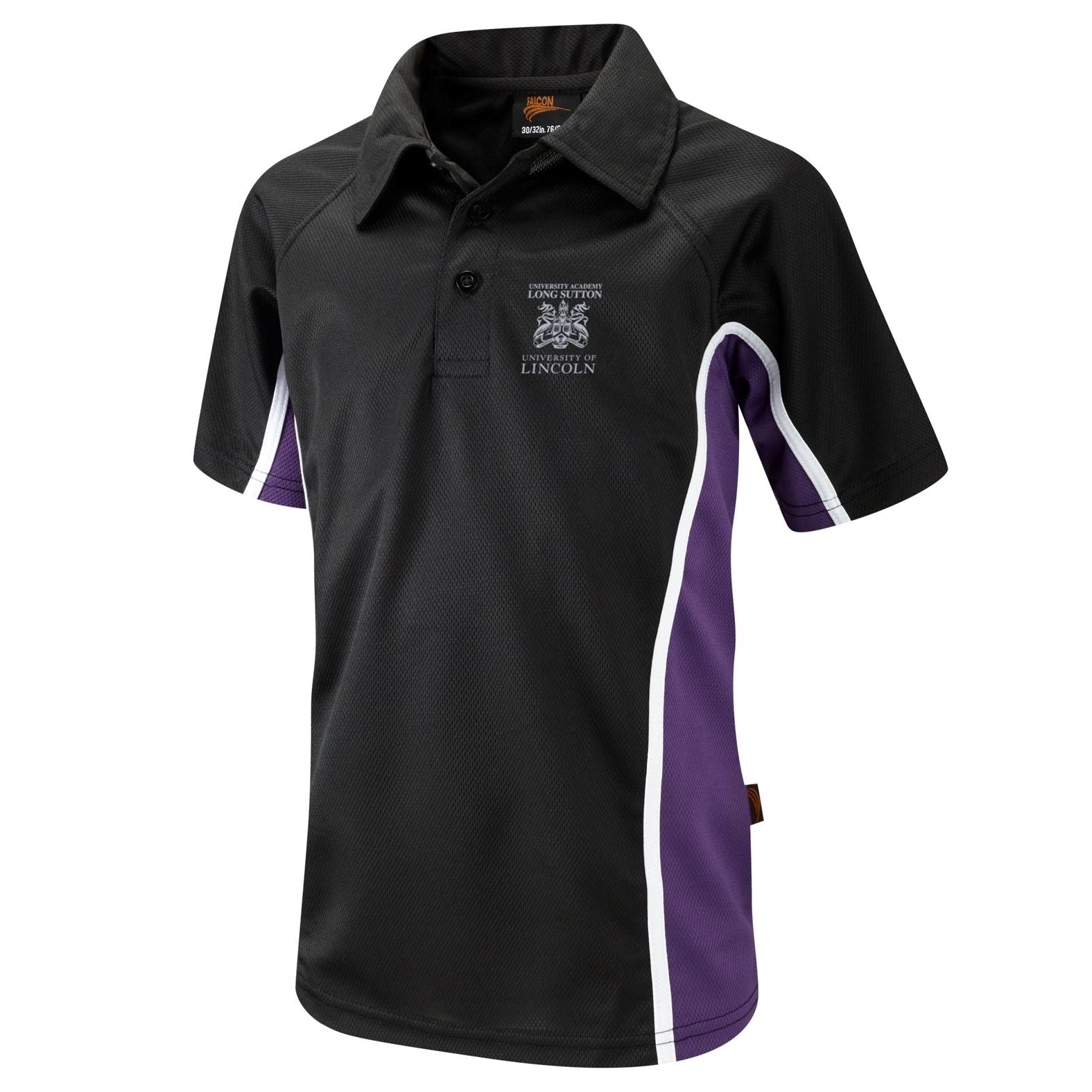 This sports top features a three button placket and short sleeves. Manufactured in school colours (black/purple) to very high standards from 100% eyelet polyester sports fabric and machine washable at 40 degrees centigrade it will dry very quickly. The sports top has the school logo embroidered to the left chest and also has an option to have student initials embroidered to the right chest opposite the logo for easy identification at an extra small charge. <strong>Please note items that have had optional personalization with initials are non-returnable.</strong>